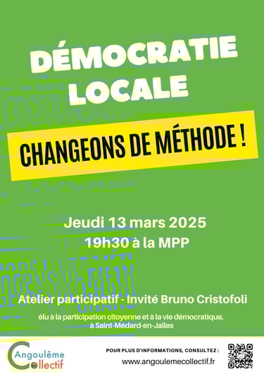 Face aux défis démocratiques et écologiques actuels, Angoulême Collectif propose une réflexion collective sur une nouvelle manière de faire de la politique locale. Nous vous invitons à participer à un atelier-rencontre sur la démocratie locale, animé par Bruno Cristofoli, adjoint à la Participation citoyenne et à la vie démocratique de Saint-Médard-en-Jalles (33).